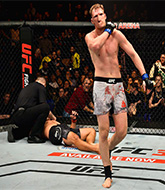 That's three minutes gone in the round. Darganyan fails with the takedown and Fighter counters with a stiff right hand. This fight brought to you by 5M nutrition - it's mmmmm tasty. Nice jab by Fighter. Darganyan darts in looking for a takedown but Fighter gets double underhooks and turns Darganyan into the cage. Fighter leaves Darganyan with his face pressed against the mat as he sprawls beautifully, defending against a solid takedown attempt. Fighter cracks Darganyan with a good shot that sees him stumbling back into the cage. Fighter lands with an uppercut that bounces Darganyan off the cage and back into range. Fighter keeps his opponent at a distance with a nice jab.